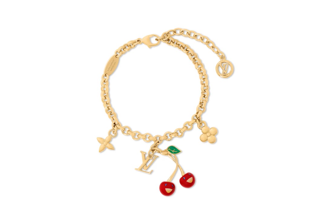 Gold-toned metal. LV Initials and Monogram Flower charms. Cherries charms (Priced at $960.00).