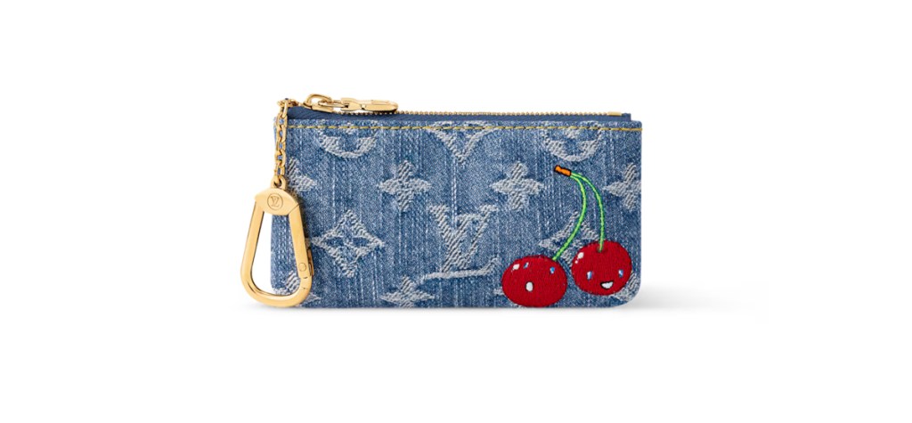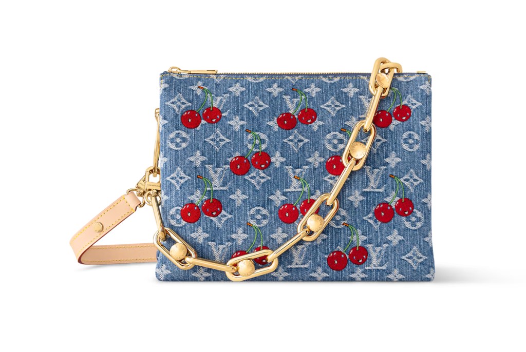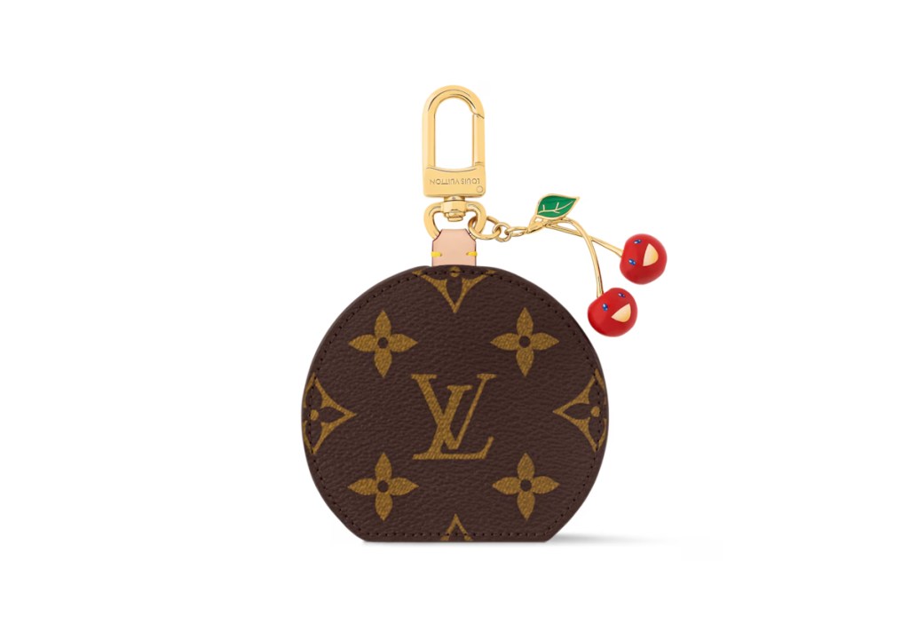 Crafted in Monogram canvas enlivened with colorful Murakami-style cherry charms, the reverse features a handy pocket mirror (Priced at $545.00).