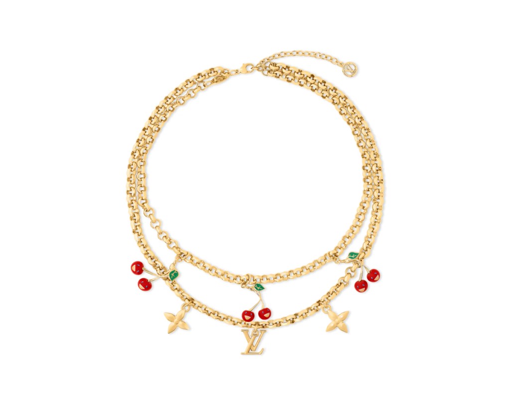 Gold-toned metal. LV Initials and Monogram Flower charms. Cherries charm. Adjustable chain with LV circle charm. Lobster clasp closure (Priced at $670.00).
